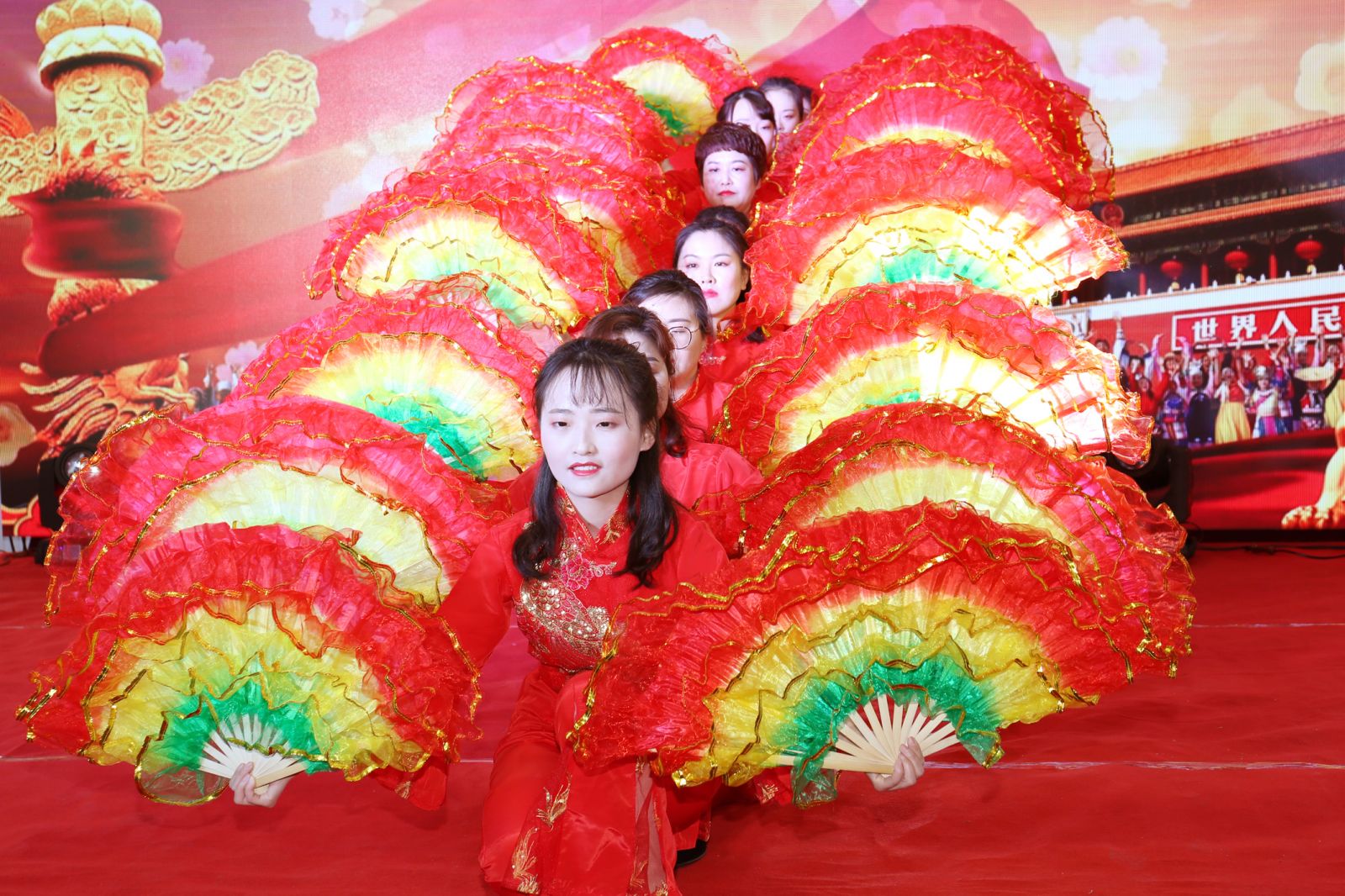 員工藝術團的姑娘們扇子舞《走(zǒu)進新時代》精彩開場,迎著太陽,我(wǒ)們鋪(pù)開七彩的畫卷,共(gòng)同走進新時代。