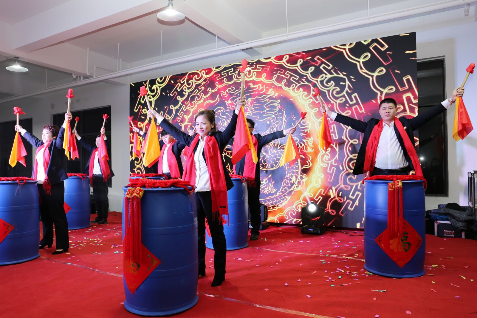行政部(bù)創意鼓舞《成人抖音中國龍》,巧妙的使用公司產品的包裝桶為鼓,引得現場一片喝彩。成人抖音中(zhōng)國龍,齊奏盛世中國紅。